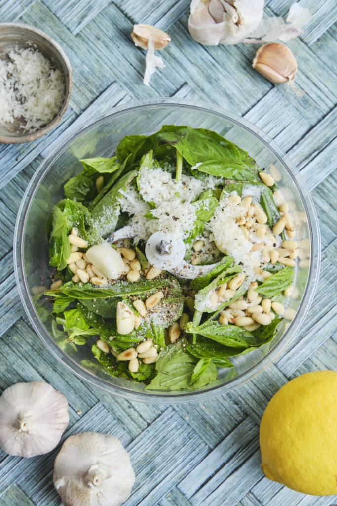 • Add the toasted pine nuts, fresh basil leaves, lemon juice, garlic, salt, and pepper to a food processor. Blend on high until the ingredients are well mixed.