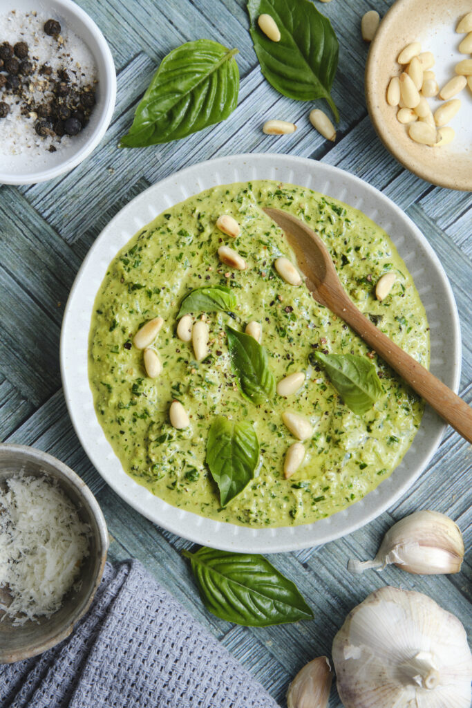 The first time I made basil pesto, it wasn’t planned. I had a small pot of basil on my windowsill that had grown wild and unruly, practically begging to be harvested. With a handful of pine nuts in the pantry, a wedge of Parmesan in the fridge, and a few cloves of garlic lying around, the decision was made.