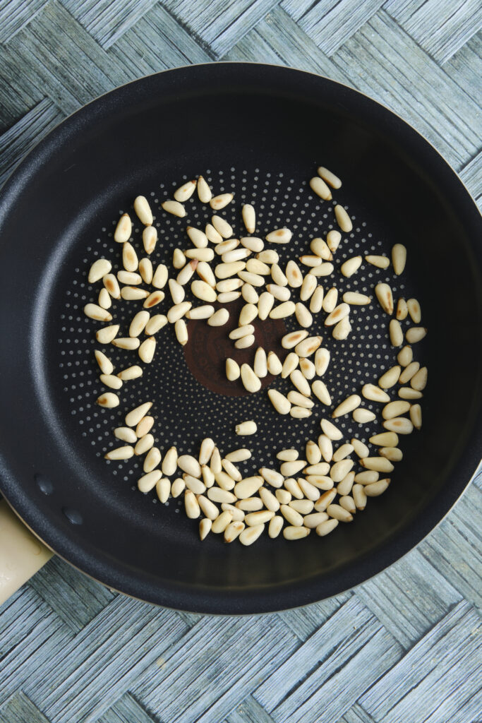 Toast the pine nuts – Place a medium skillet over medium heat and lightly toast the pine nuts for about a minute, or until they turn golden brown. Remove them from the pan and let them cool.