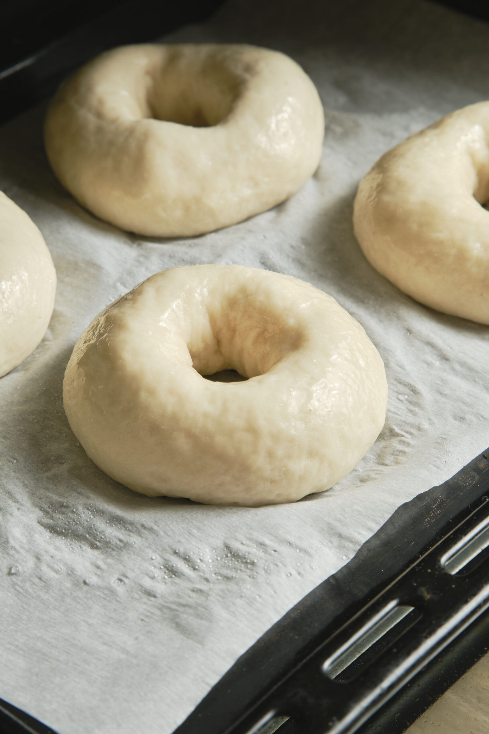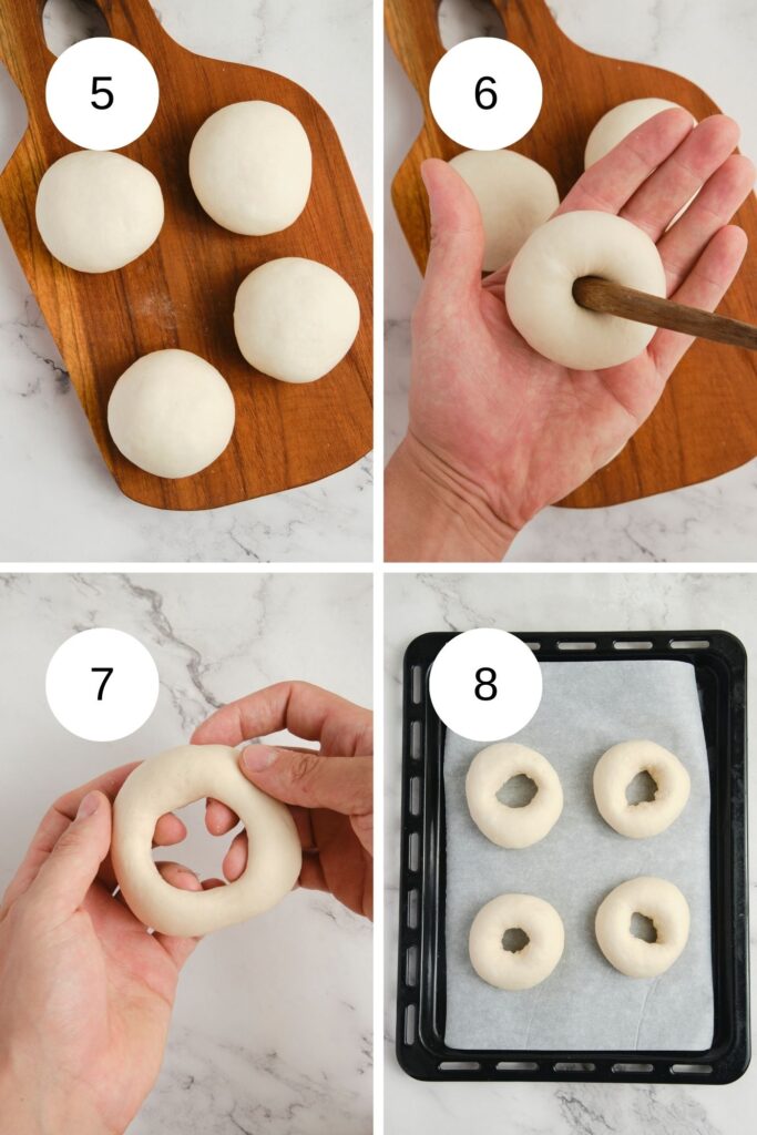 Divide the dough into 4 pieces and let them rest briefly. Shape each piece into a bagel, place on a baking sheet, and cover. Let them rise briefly or refrigerate overnight. Before baking, bring to room temperature if chilled and preheat the oven to 450°F (photos 5-8).