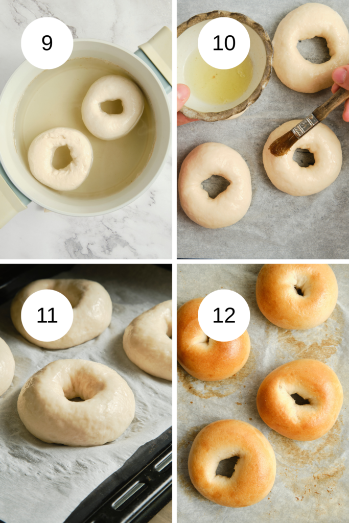 Poach and bake – Bring water and maple syrup or honey to a boil in a large pot. Boil the bagels for 1 minute per side, then place them on a baking sheet and brush with egg wash. Bake until lightly golden brown (photos 9- 12).