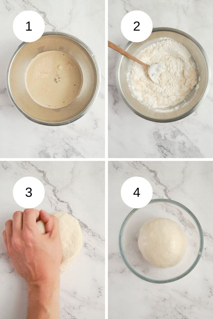 Make the dough – Mix warm water, instant yeast, and maple syrup or honey in a bowl and let it sit until foamy. Add bread flour and salt, then knead the dough until smooth and elastic. Shape into a ball, place in a lightly oiled bowl, cover, and let rise in a warm place until doubled in size (photos 1- 4).