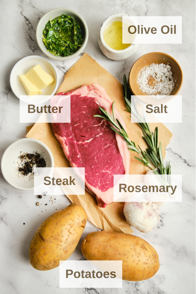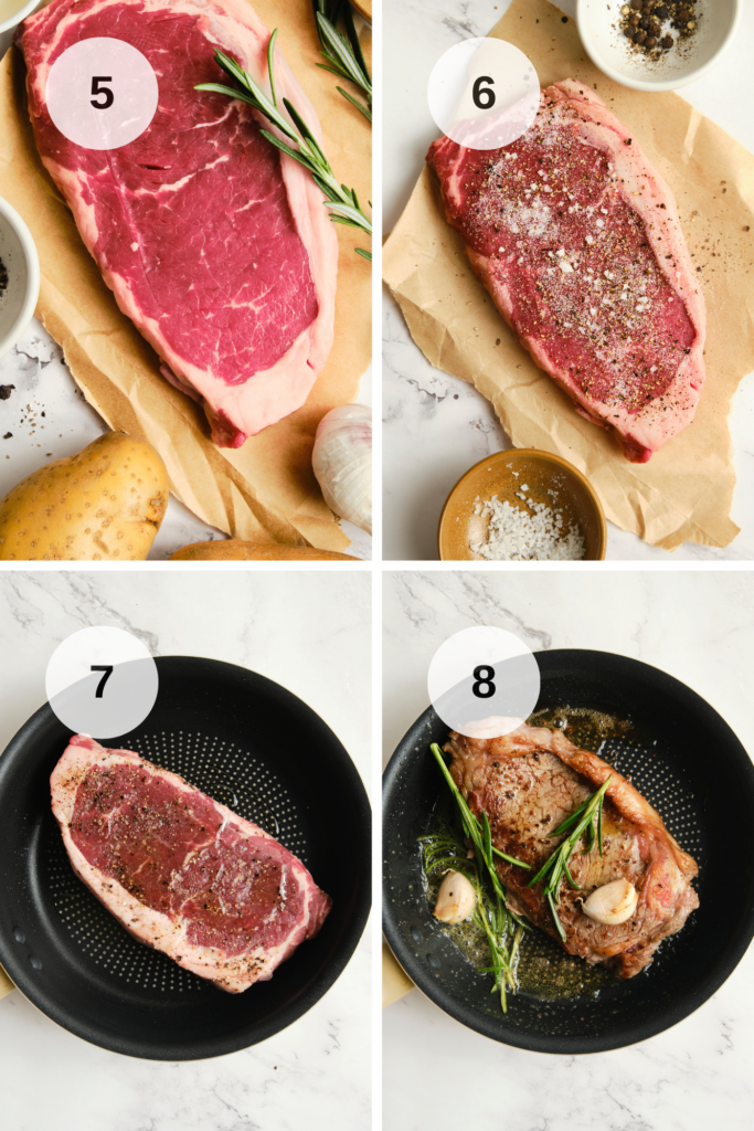 Sear the Steak – Bring the steak to room temperature and season with salt and pepper. Heat oil in a cast-iron skillet until shimmering, then sear the steak 4 minutes per side. Add butter, garlic, and thyme, basting while cooking 3–4 more minutes for medium-rare. Let rest 10 minutes before slicing or serving (photos 5- 8).