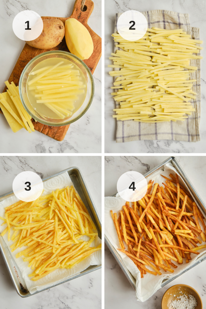 Make the Fries – Cut the potatoes into ¼-inch thick, 3-inch long strips and soak them in cold water for at least 30 minutes or up to 12 hours in the fridge to remove excess starch for crispier fries. Drain and dry the potatoes thoroughly. Heat oil and carefully fry the potatoes in batches for 6–7 minutes until tender but not browned, stirring occasionally. Remove and drain on a paper towel-lined wire rack, then let rest for 20–30 minutes (or longer if prepping ahead). Reheat the oil to 350°F (177°C) and fry the potatoes a second time in batches for 3–4 minutes until golden and crispy. Drain again on a clean wire rack with fresh paper towels, season immediately with salt and optional herbs or seasonings, and toss to coat evenly before serving (photos 1- 4).