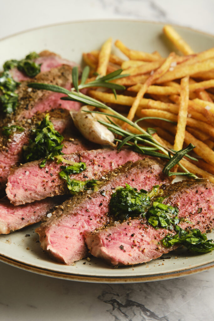- Divide the steak between plates, sprinkle with flaky sea salt, and serve with a generous portion of crispy fries on the side.