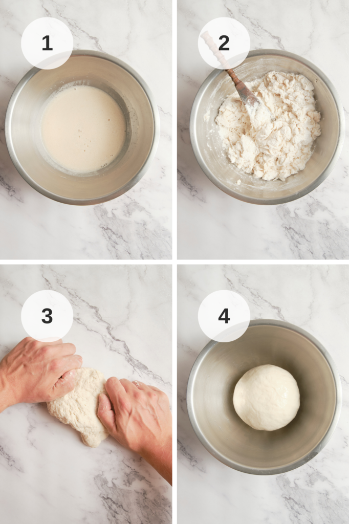 Prepare the dough – In a large mixing bowl, combine 1 cup of warm water, dry yeast, and sugar, stirring until dissolved. Add ½ cup of flour and whisk to create a loose sponge. Leave the bowl in a warm place for about 15 minutes until the mixture becomes bubbly. Next, add salt, olive oil, and most of the remaining flour, reserving about ½ cup for dusting. Mix until a rough, sticky dough forms, then lightly dust with flour and knead briefly in the bowl to bring the dough together. Transfer the dough to a lightly floured surface and knead for a few minutes until smooth. Let it rest for 10 minutes, then knead again for another couple of minutes, adding a little flour if needed. Lightly oil the mixing bowl, place the dough back inside, and turn it to coat with oil. Cover tightly with plastic wrap and a kitchen towel, then let it rise in a warm place for about 1 hour, or until doubled in size (photo 1- 4).