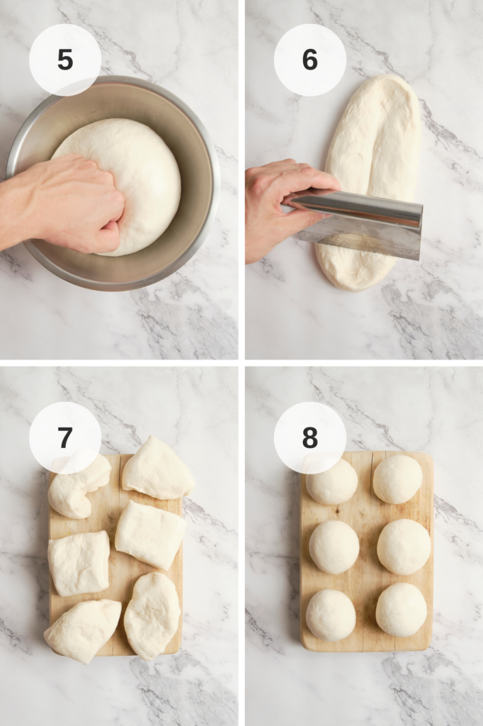 Shape the dough – Place the dough on a clean work surface and gently deflate it. Divide it into 7–8 equal pieces and shape them into balls. Cover with a towel and let them rest for about 10 minutes (photo 5- 8).