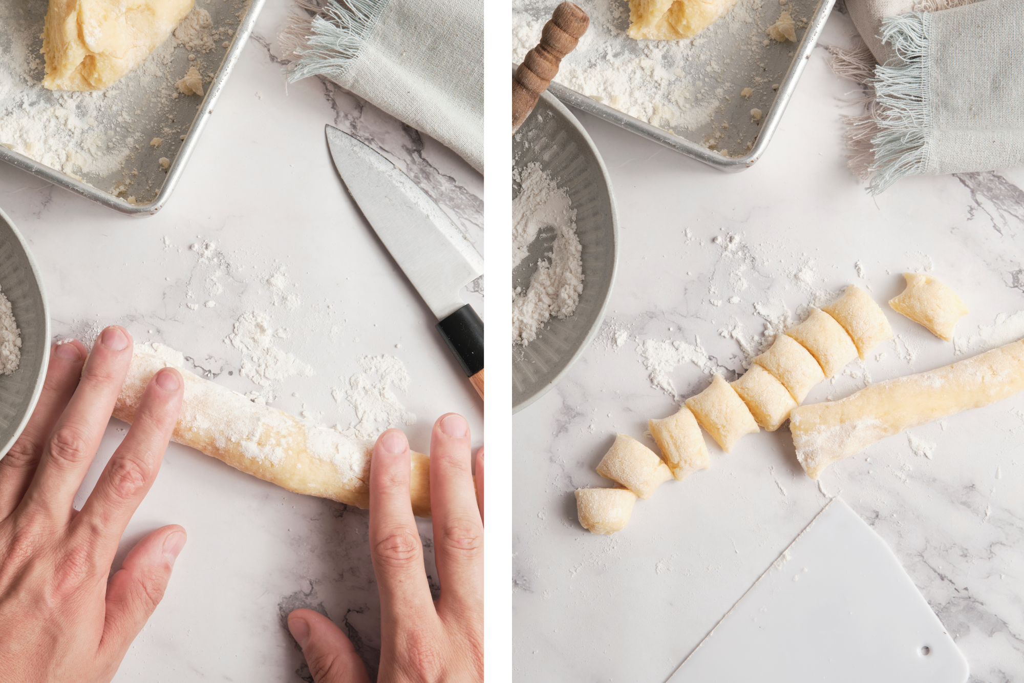 Cut the dough. Once the dough is ready, divide it into several smaller portions. Roll each portion into a long rope about the thickness of your thumb. Using a knife or bench scraper, cut the rope into small bite-sized pieces.
