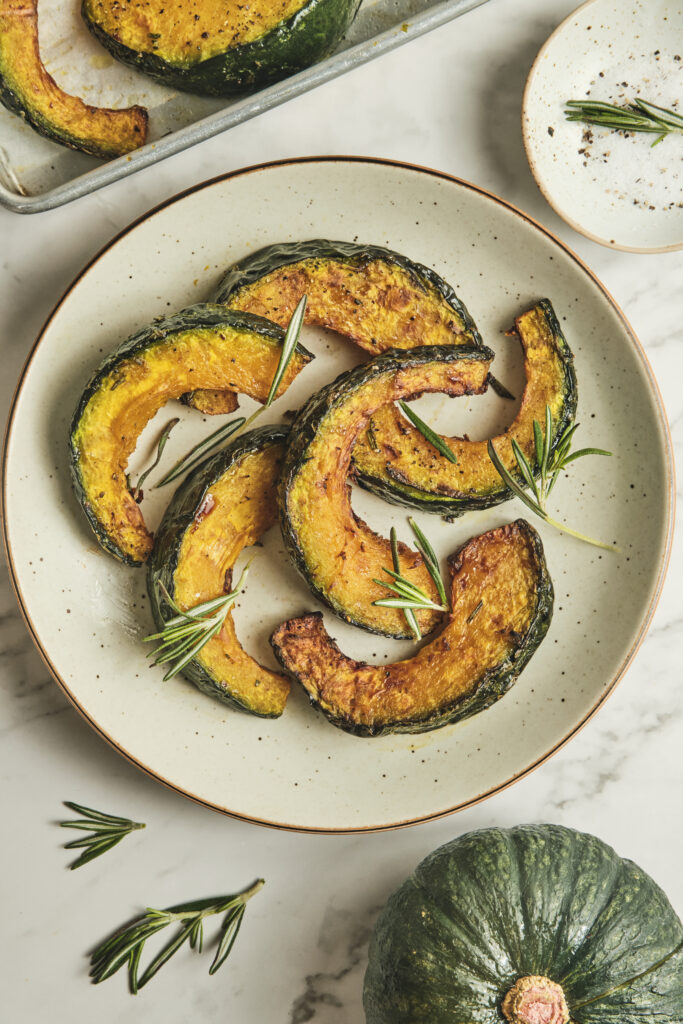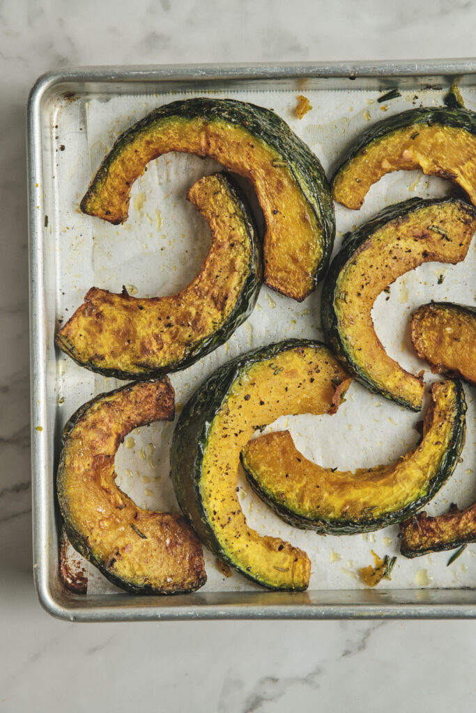 - Roast in the oven for 25–35 minutes, turning once halfway through, until the pumpkin is tender and lightly golden around the edges.