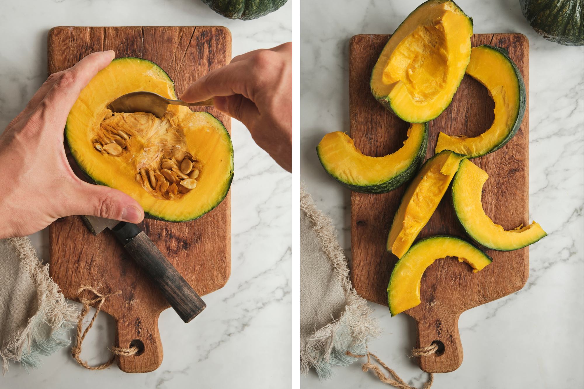 - Cut the pumpkin in half and remove the seeds. Peel if needed, then cut the pumpkin into evenly sized wedges.