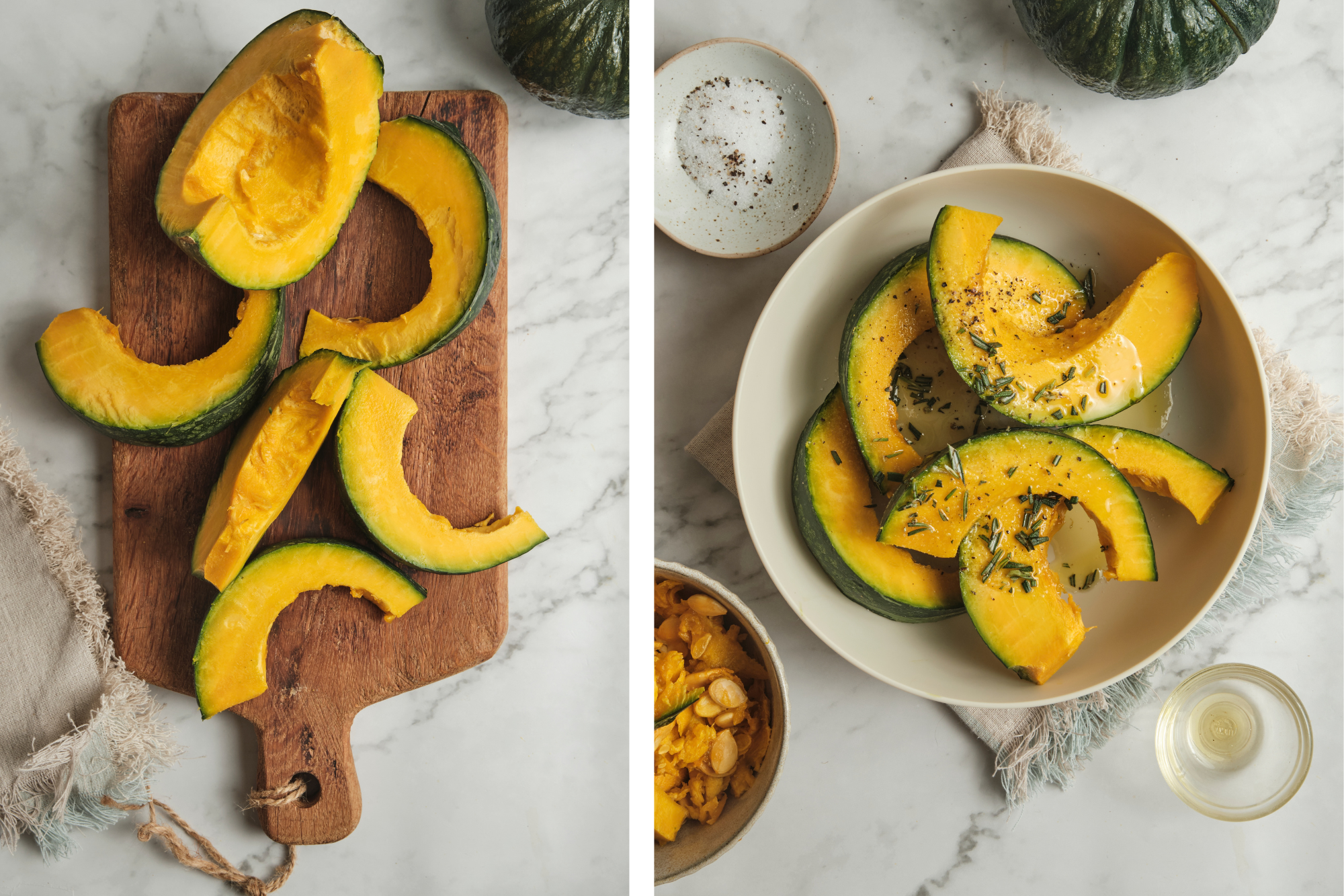 - Place the pumpkin pieces in a large bowl. Drizzle with olive oil, add salt and pepper, and toss well so all pieces are evenly coated. Strip the leaves from the rosemary sprig, roughly chop them, and add them to the bowl.
