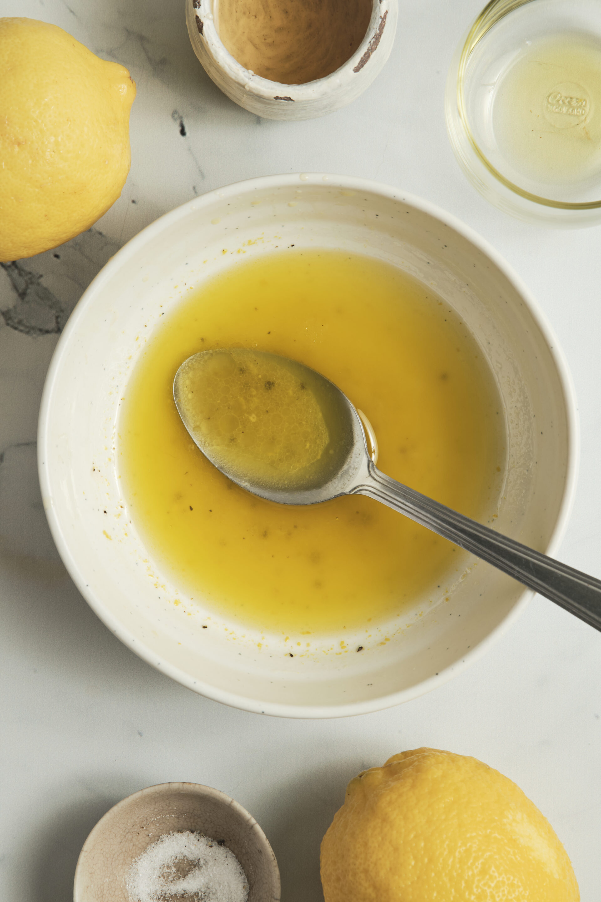 - In a small bowl, whisk together lemon juice, honey, dijon mustard, salt, and pepper.