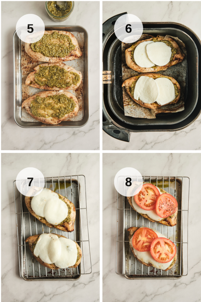 Spoon a small amount of pesto over each piece of chicken, then top with fresh mozzarella slices. Return to the air fryer for 1–2 minutes, just until the cheese softens and becomes slightly melted (Photo 5 & 6).
