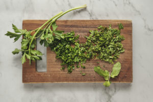 Finely chop the mint leaves and parsley until small and evenly cut, keeping a bit of texture.