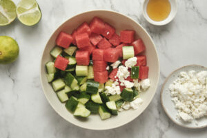 Keep the watermelon and cucumber chilled before assembling for a more refreshing salad.
