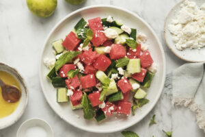 A refreshing watermelon feta salad with mint, cucumber, and a tangy-sweet dressing. Quick, easy, and perfect for warm days.